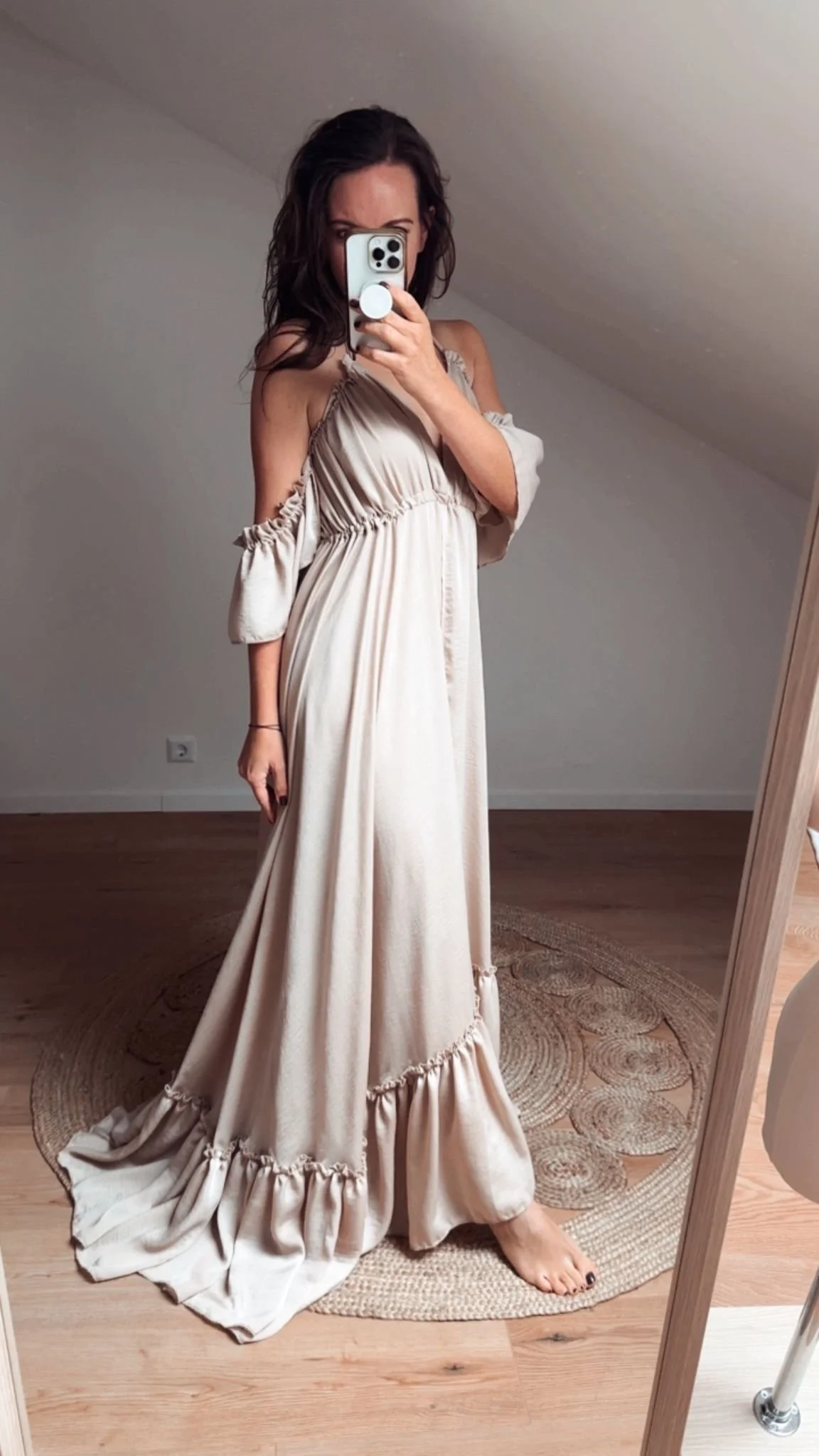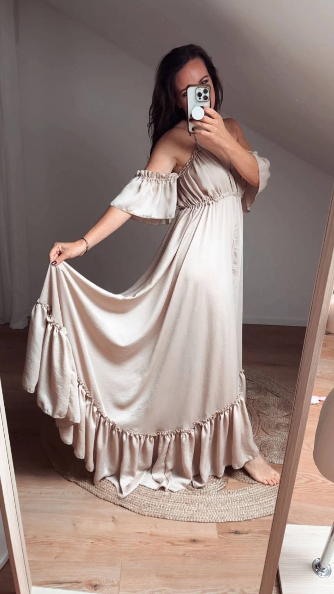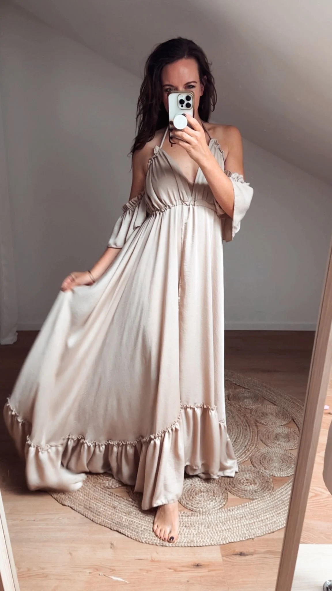 Der wunderschön fließende Rock wird durch diese crinkle Optik besonders hervorgehoben. Vorne in der Mitte des Rockes ist bis zum Gürtel hoch ein überlappender Schlitz, durch den man sich bei Fotoshootings sehr natürlich bewegen kann. Das raffinierte Oberteil wird als Neckholder gebunden und kann durch die seitlichen Raffungen an Deine Oberweite ideal angepasst werden. Als kleiner Hingucker habe ich noch zarte Off-Should- Ärmelchen mit Gummizug an das Kleid genäht. Es verleiht dem Ganzen das gewisse Etwas für Dein Shooting.