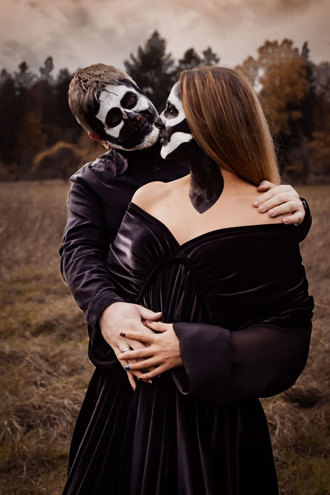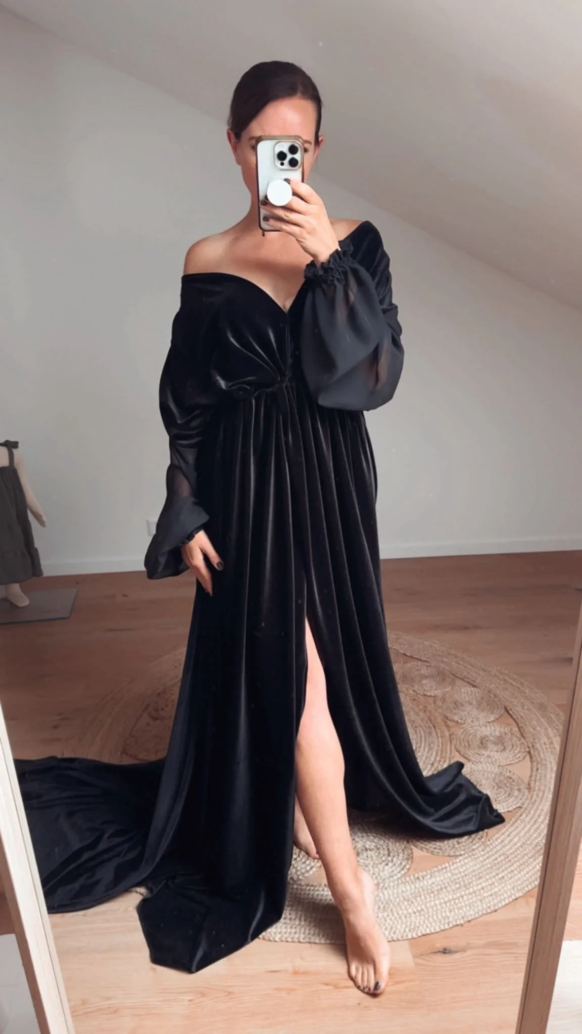 Dieses Kleid ist eine Kombination aus Samt mit Chiffonärmeln. Es hat eine ca 1,5m lange Schleppe und einen überlappenden Schlitz vorne in der Mitte, sodass man damit problemlos laufen, einen Babybauch präsentieren oder ganz toll auch auf den Pferd tragen kann.